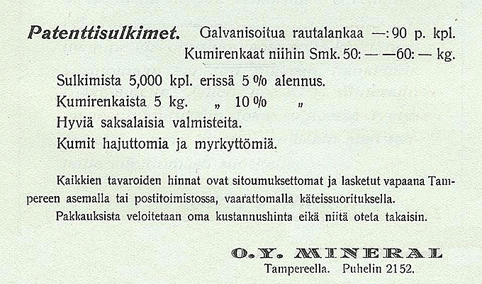 Patenttikorkkeja ja mekanismeja tehtaille toimitti 1920-luvulla ainakin Oy Mineral. Patenttikorkit olivat kuitenkin uusiokäytön kannalta vaikeita puhdistaa. Korkin porsliiniosa, tiiviste tai mekanismi saattoi hajota ja se tuli valmistajille kalliiksi. Markkinoilla oli 1930-luvulla monia uusia menetelmiä sulkea pullo tiiviisti. Yksi uusi keksintö oli "C-kapseli" jota valmisti Oy Åberg & Ahlblad Ab Helsingissä. Myös kruunukorkkien myötä patenttikokkeja käytettiin aina vähemmän ja vähemmän. Ennen kruunu-korkkeihin siirtymistä useat valmistajat sulkivat pullonsa repäistävillä alumiinisella korkeilla.