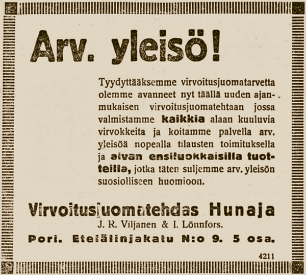 Virvoitusjuomatehdas Hunaja, Viljanen & Lönnfors