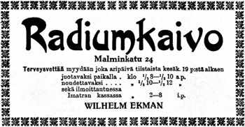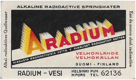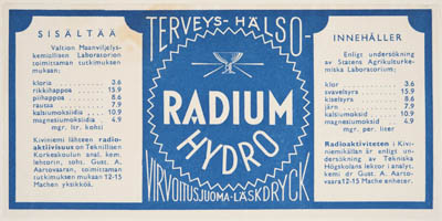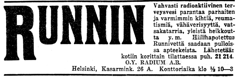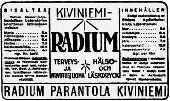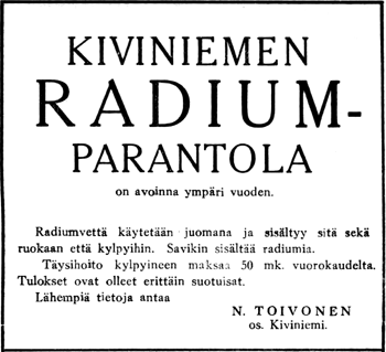 Radiumia lääkinnällisiin tarkoituksiin tarjonneita tehtaita, tuotemerkkejä ja myyjiä suomessa vuosina 1910-1940. Tarinoissa mainittujen kaivojen ja lähteiden tutkimustulokset perustuvat suurelta osin teknisen korkeakoulun analyyttisen kemian lehtori Gustaf Adolf Aartovaaran tutkimuksiin.