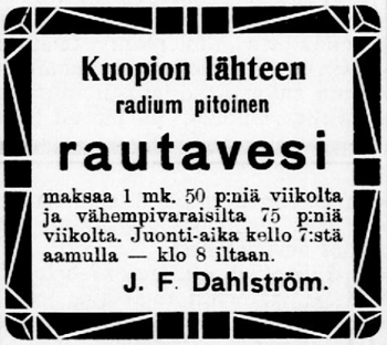 Raatimies vesitehtailija J. F. Dahlströmin omistaman kivennäisvesitehtaan tontilla on rautapitoisen veden lähde (kaivo). Kaivon vettä on käytetty virvoitusjuomien valmistukseen vuodesta 1890. Vuonna 1910 veden koostumus tutkittiin varta vasten saksasta tilatuilla laitteilla ja sen todettiin sisältävän suuressa määrässä radiumia. Tutkimukset tehtiin 28.04.1910 ja ne suoritti teknisen korkeakoulun lehtori Gustaf A. Aartovaara. Tämä lähde mainitaan ollen ensimmäinen lähde suomessa, jossa todettiin erityisten laitteiden avulla olevan radiumia. Lähteen kaupallisesta toiminnasta vastasivat tohtori Karl ja Ingeborg Loveson. Hetkellisesti lähdettä kutsuttiin nimellä "Kuopion Uusi Parannuslähde".