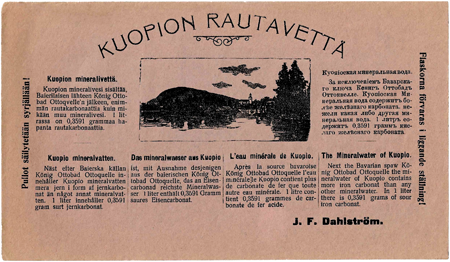 Kuopion Rautavesilähde: Käkisalmen Sanomat 1910 no 49, Savo 1910 no 78, 1910 no 84, 1911 no 59, 1912 no 2, Kauppalehti 1910 no 21, etiketti: Ulf Lundström.