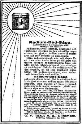 Teknokemian tuotteiden valmistaja Oy Teka Ab valmisti 1920-luvun puolivälissä kylpysaippuaa, jossa oli mukana radiumia. Tuote oli markkinoilla muutaman vuoden.
