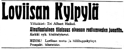 Loviisan kylpylän vesi todettiin teknisen korkeakoulun lehtori Gustaf A. Aartovaaran tutkimuksissa keväällä 1925 sisältävän huomattavia määriä radioaktiivisuutta. Tämä tutkimus teki ennestään kuuluisan kylpylän vieläkin kuuluisammaksi. Samalla aloitettiin radiumpitoisen terveysveden tarjoilu asiakkaille.