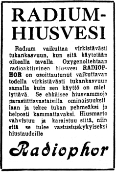 Hammastahnoistaan tunnetun Oxygenolin valmistamaa radium -hiusvettä markkinoitiin vuosina 1921-1925 nimellä Radiophor. Tuote sisälsi myös elvykettä ja antiseptistä ainetta ja sen luvattiin ehkäisevän hiusvammoja parasiittivastaisilla ominaisuuksilla. Hiusvettä myivät apteekit ja rohdoskaupat.