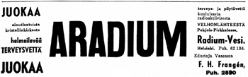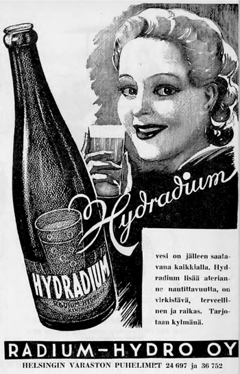 Radiumlähde Oy, Radium-Hydro Oy: Käkisalmen Sanomat 1925 no 84, 1925 no 108, 1930 no 6, Iltalehti 1925 no 226, 1925 no 226, HS 1925 no 167, Karjala 1925 no 268, 1926 no 69, 1931 no 164, Terveys 1927 no 5, PRH 1925, 1930, Aamulehti 1929 no 217, Vaasa 1936 no 204, Uusi Suomi 1937 no 176, Kaiku 1937 no 101, OTKn viikkotietoja 1937 no 36, 1937 no 37, Tavaraleima rek 1937 no 10, Suom Kaupparek 1938 no 31, 1939 no 15, Matkailumaailma 1939 no 3, Olympia Aikakauskirja 1939 no 7-8, Maakansa 1939 no 125, Finna (hydro etiketti).