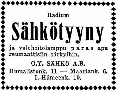 Tämä sähkötyyny lienee jokin kertaluonteinen myyntiartikkeli tms. vuodelta 1934. Oy Sähkö Ab:n toimenkuva oli sähkölaitteet ja niiden myynti. Ei ole tiedossa missä muodossa radium oli tyynyssä?