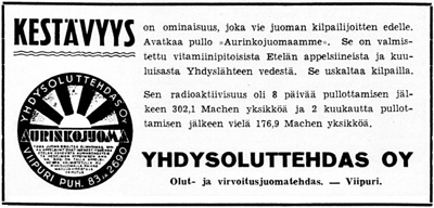 Viipurissa Yhdysoluttehtaan tontilla oli kirkasvetinen yhdyslähteeksi nimetty lähde, josta tehdas otti vetensä. Vettä sai lähteestä niin runsaasti, että sitä käytettiin juomien valmistuksen lisäksi myös pesuvetenä. 1930-luvulla lähteen vesi tutkittiin ja siinä todettiin olevan radioaktiivisuutta melko runsaasti. Näin ollen veden sisältämä radioaktiivisuus liitettiin myös mainoksiin ja etenkin vuonna 1938, jolloin tehdas täytti 75 vuotta, radioaktiivisuus mainitaan jopa pullon etiketissä.