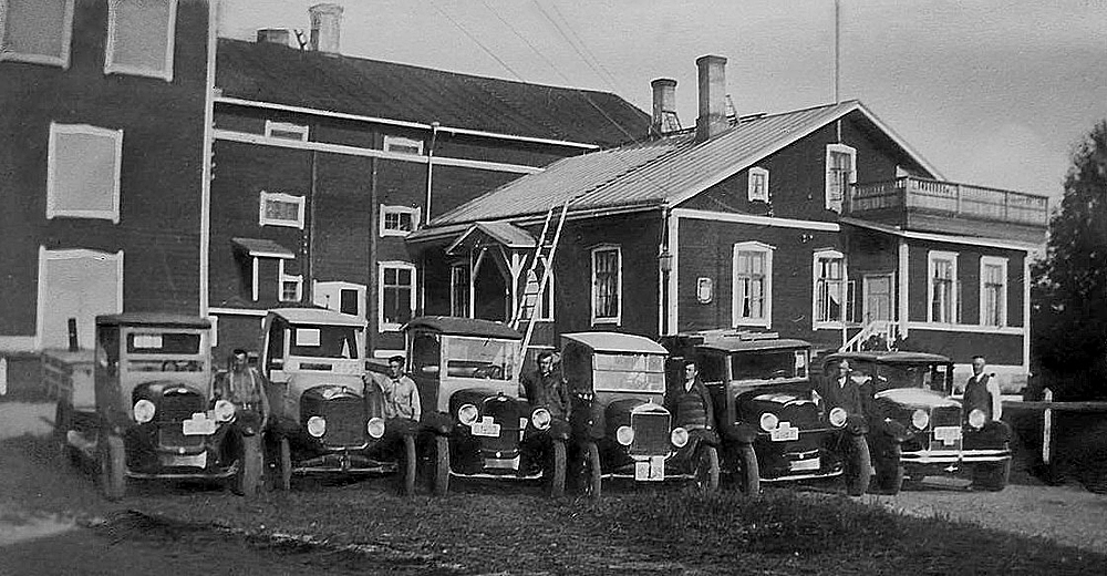 Oluttehtaan autoja kuskeineen 1930-luvulla. Oikeassa reunassa johtaja Veikko Gellin.