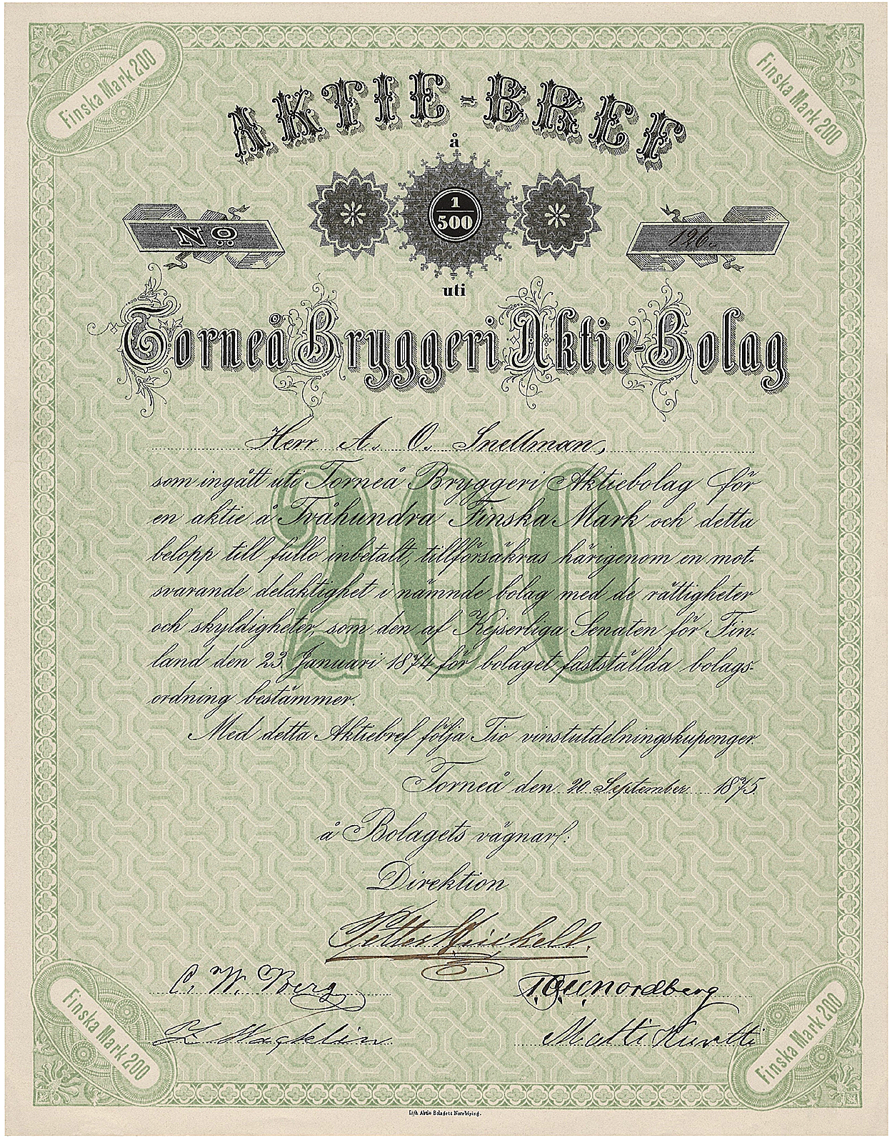 Oluttehtaan nimeksi tuli Torneå Bryggeri Aktiebolag ja sen osakepääoma oli 100.000 markkaa (500 kpl à 200 mk). Yhtiön säännöt vahvistettiin senaatissa 23.1.1874.